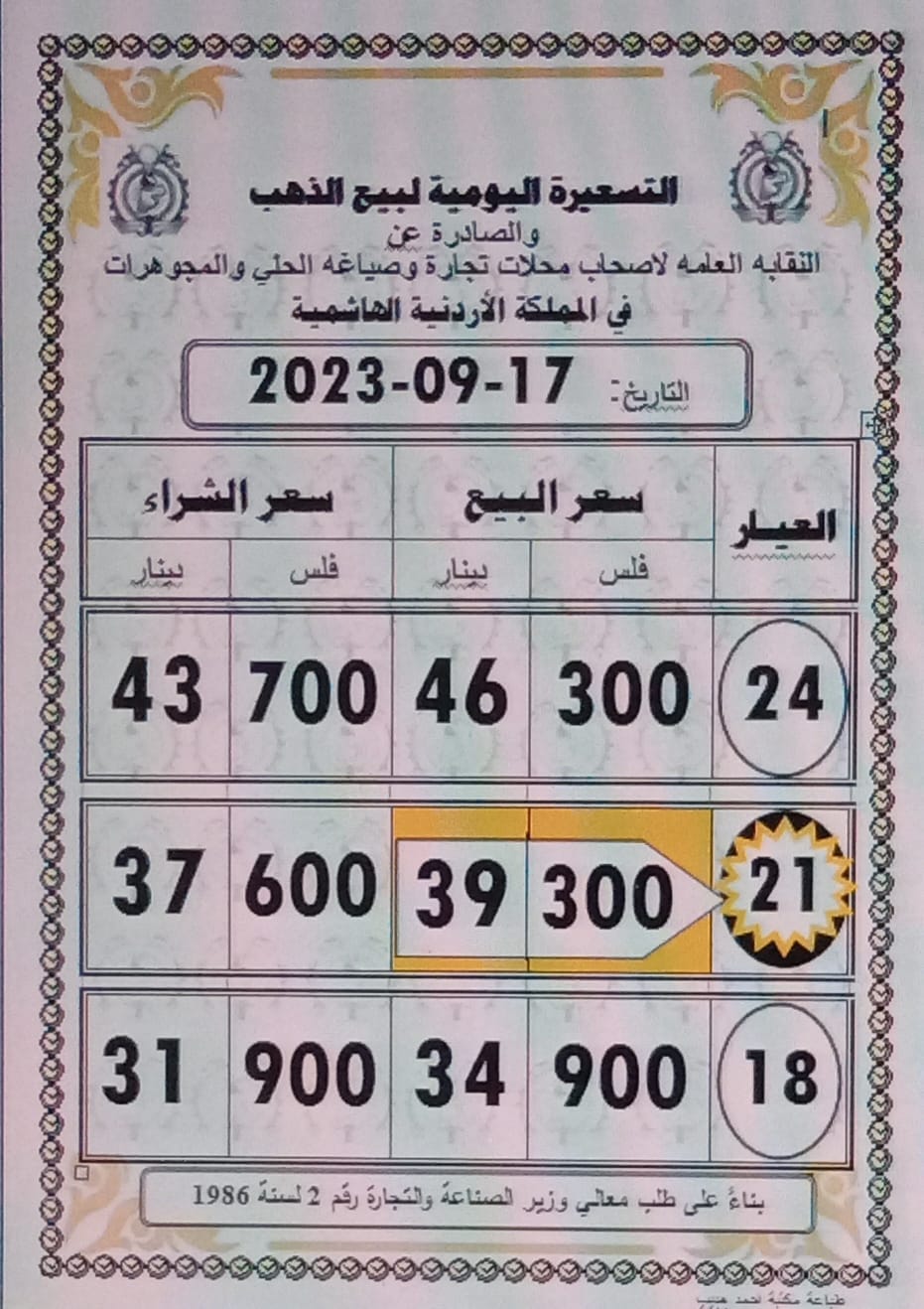وبلغ سعر جرام الذهب من عيار 21، الأكثر طلبا لدى الأردنيين، 39.30 دينارا لجهة الشراء من المحال، و37.60 دينارا لجهة البيع.