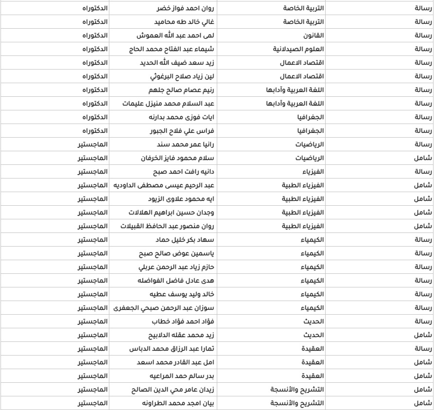 إنجاز-أعلنت كلية الدراسات العليا في الجامعة الأردنية، اليوم الاثنين، أسماء المرشحين للقبول في برامج الدراسات العليا (الدكتوراه والماجستير) في التخصصات التي لم تعلن سابقاً والدفعة الثانية بدل استنكاف للفصل الدراسي الأول للعام الجامعي 20232024.