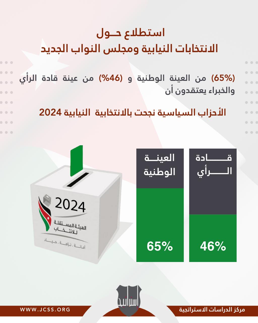 الغالبية العظمى (65%) من العينة الوطنية يعتقدون أن الأحزاب السياسية نجحت في التجربة الانتخابية الأخيرة، و (46%) من عينة قادة الرأي والخبراء يعتقدون أن الأحزاب السياسية نجحت في هذه التجربة الانتخابية.