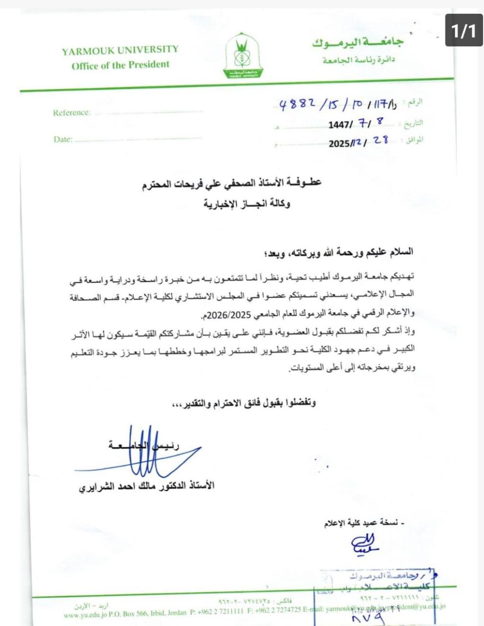 قرر رئيس جامعة اليرموك الأستاذ الدكتور مالك أحمد الشرايري تسمية رئيس مجلس ادارة جمعية البيئة الاردنية ورئيس هيئتي تحرير مؤسسة إنجاز الإخبارية ونافذة البيئة و التنمية الاخباري الزميل الصحفي علي عزبي فريحات عضوًا في المجلس الاستشاري لكلية الإعلام – قسم الصحافة والإعلام الرقمي في جامعة اليرموك وذلك للعام الجامعي 2025/2026.