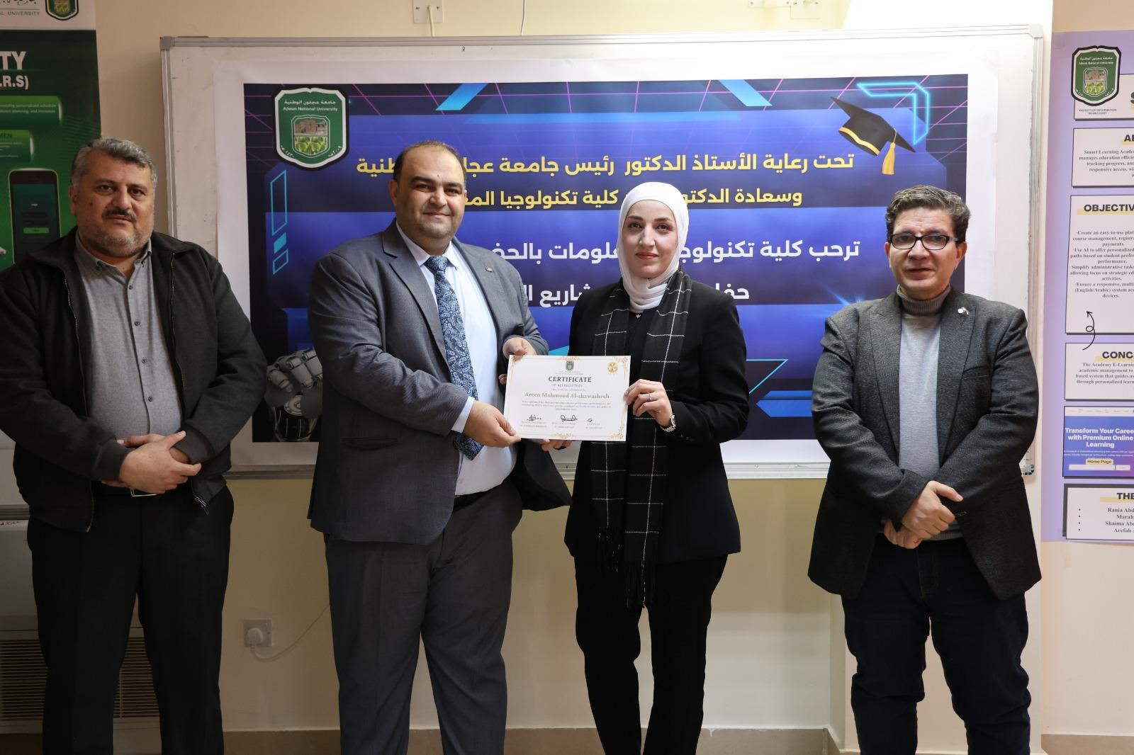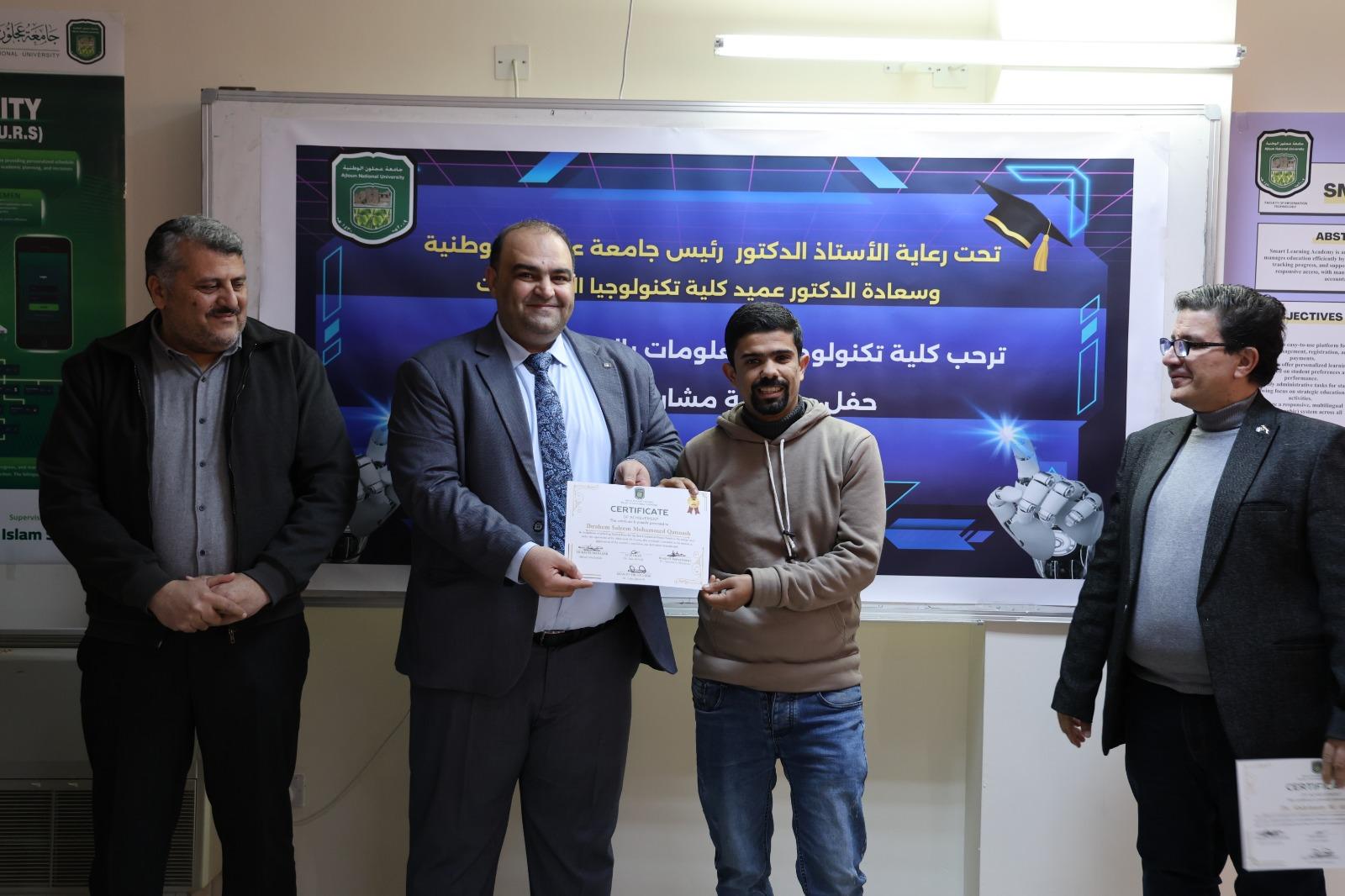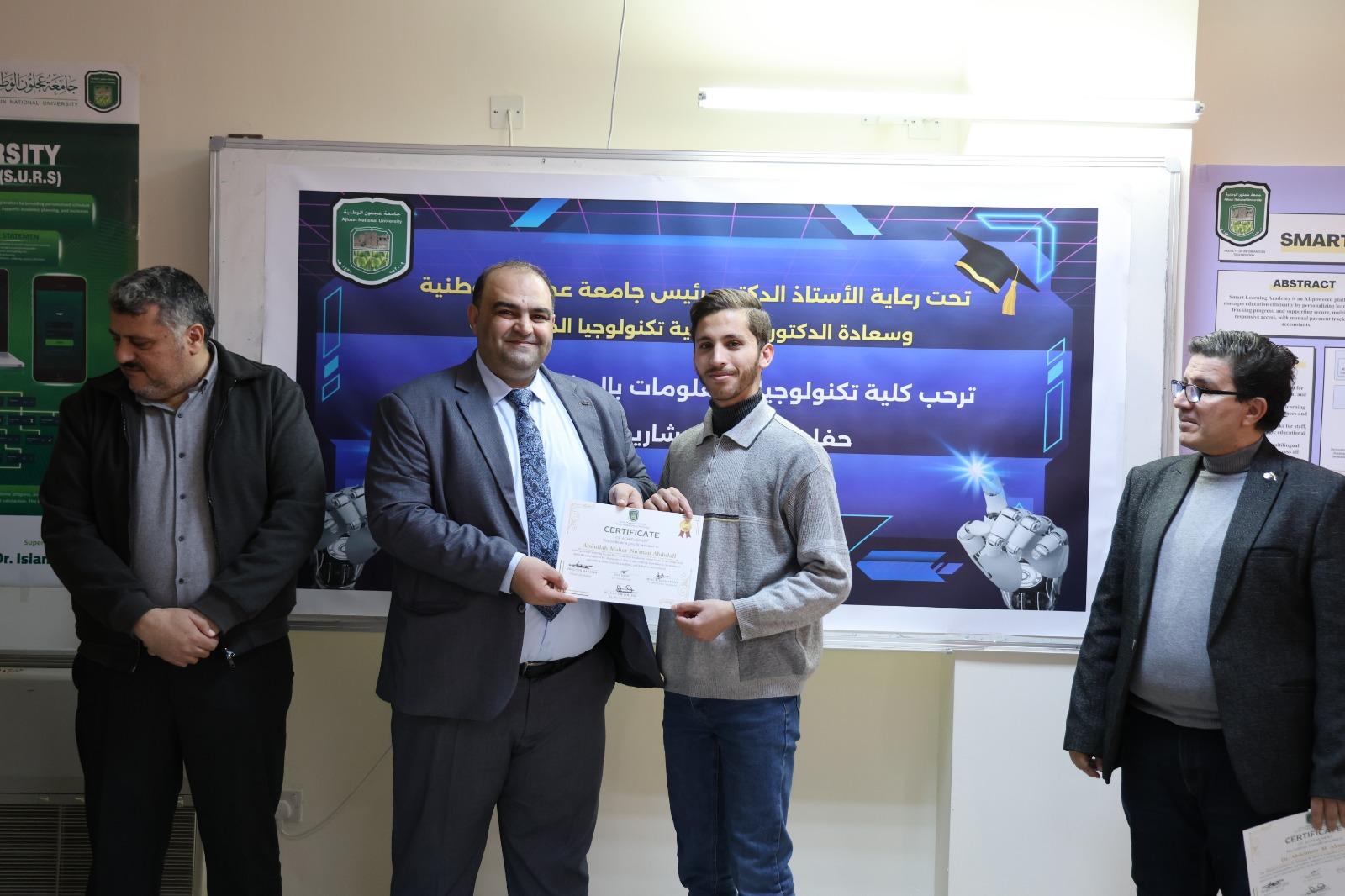 وعلى هامش الزيارة التقى العلاونة بالطلبة من كلية تكنولوجيا المعلومات وتم تسليم الشهادات لهم .