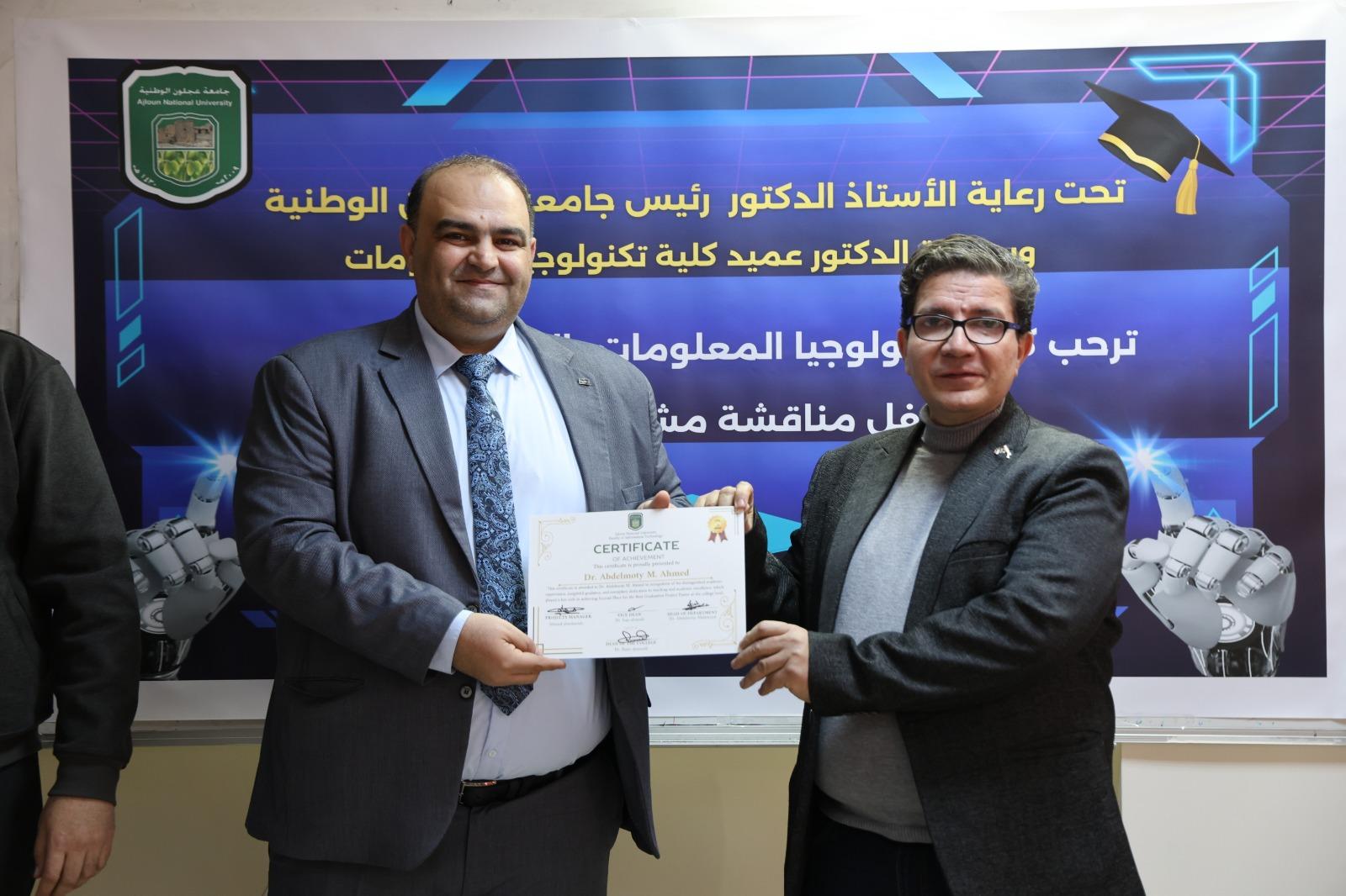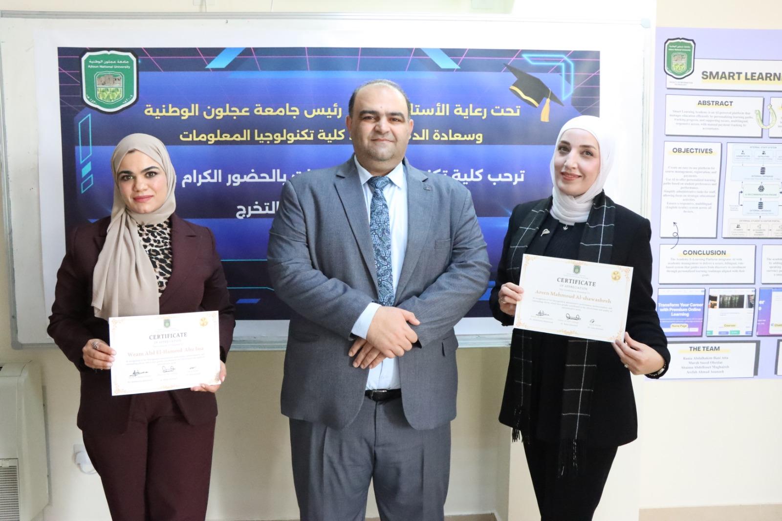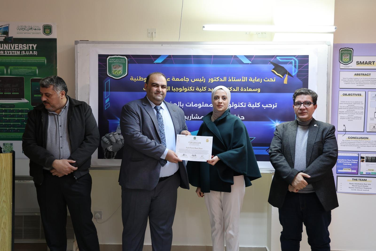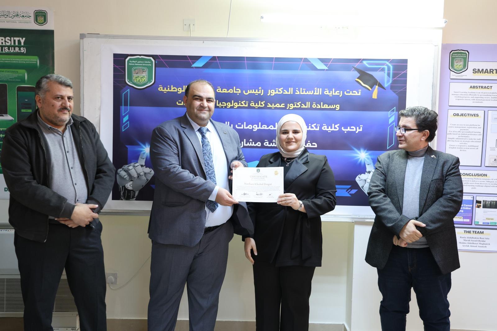وعلى هامش الزيارة التقى العلاونة بالطلبة من كلية تكنولوجيا المعلومات وتم تسليم الشهادات لهم .