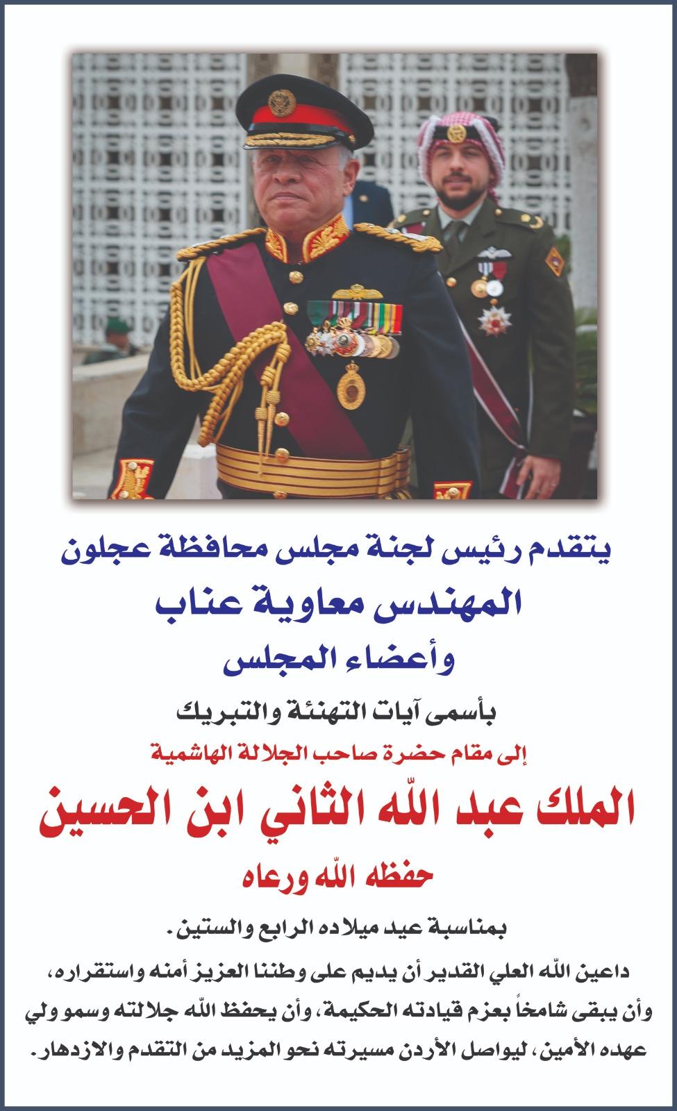 هنأ رئيس لجنة مجلس محافظة عجلون المهندس معاوية عناب واعضاء لجنة المجلس جلالة الملك عبدالله الثاني بمناسبة عيد ميلاده الـ 64.