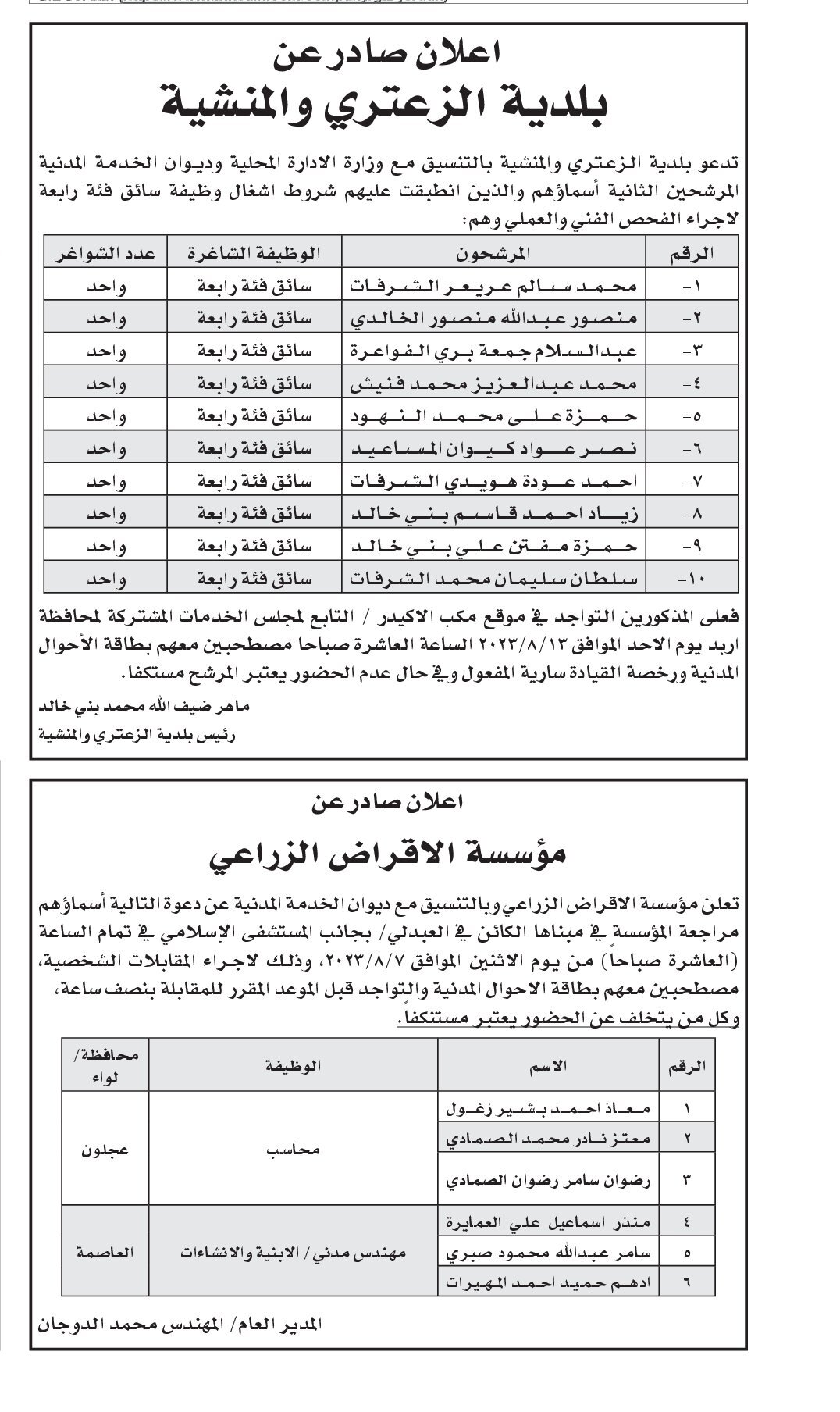 إنجاز-دعت وزارات ومؤسسات الحكومية، وبالتنسيق مع ديوان الخدمة المدنية، عدد من المرشحين لاستكمال إجراءات التعيين، وذلك من خلال المقابلات في الأماكن والمواقع المحددة ضمن كل شاغر، وبحسب ما هو مرفق في كل محددات كل وظيفة.
