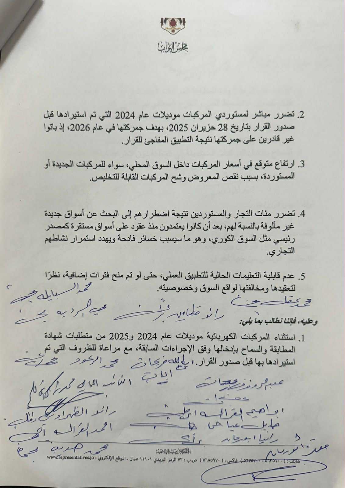 وختم النواب مذكرتهم بالتأكيد على أن القرار الحكومي بصيغته الحالية أضرّ بعدد كبير من القطاعات الاقتصادية ويفتقر للجاهزية التطبيقية، مشيرين إلى أن المصلحة الوطنية تقتضي إعادة النظر به لتحقيق التوازن بين ضبط الجودة والسلامة واستقرار الأسواق وحماية الاستثمار الوطني.