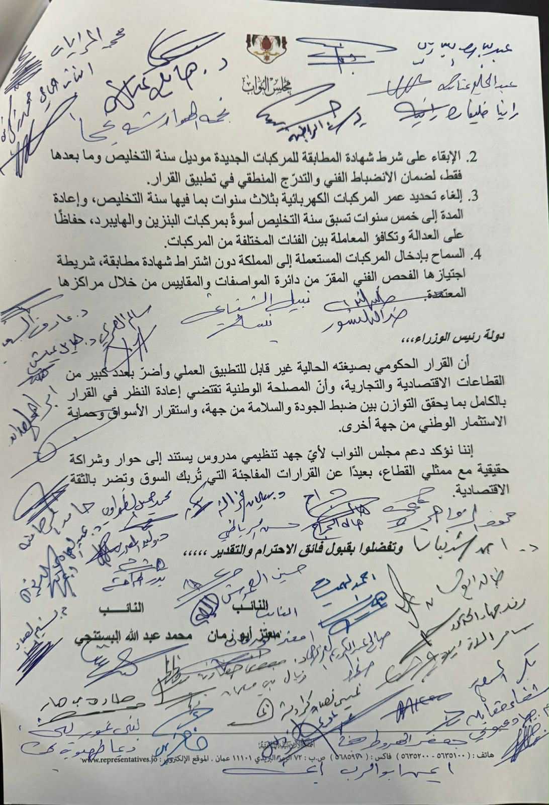 ووقّع على المذكرة عدد كبير من النواب دعمًا لمطالب أبو رمان والبستنجي في حماية القطاع وتنظيم السوق بما يراعي المصلحة الوطنية.