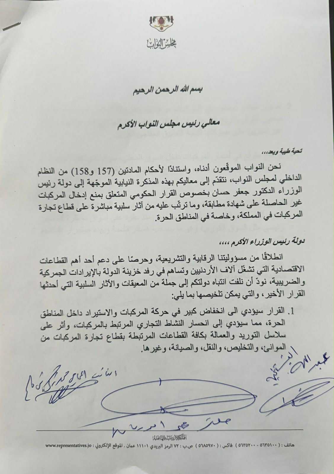 و استند النواب في مذكرتهم إلى مسؤوليتهم الرقابية والتشريعية، مؤكدين حرصهم على دعم قطاع تجارة المركبات الذي يوظف آلاف الأردنيين ويسهم في رفد خزينة الدولة.