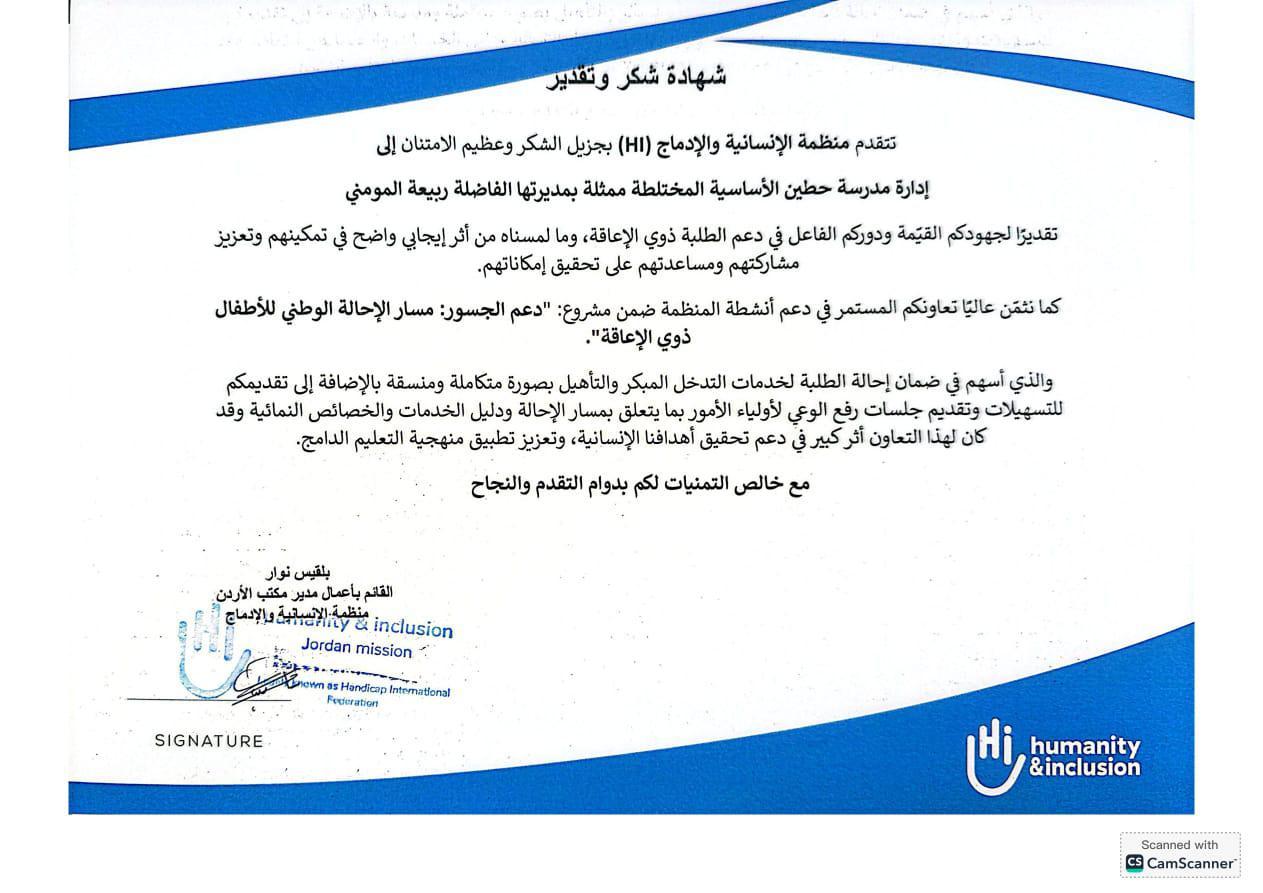 انجاز -قدّمت منظمة الإنسانية والإدماج (HI) شهادة شكر وتقدير لمدرسة حطين الأساسية المختلطة ممثلة بمديرتها ربيعة المومني تقديراً لجهودها في دعم الطلبة من ذوي الإعاقة وتعزيز مشاركتهم في البيئة التعليمية.