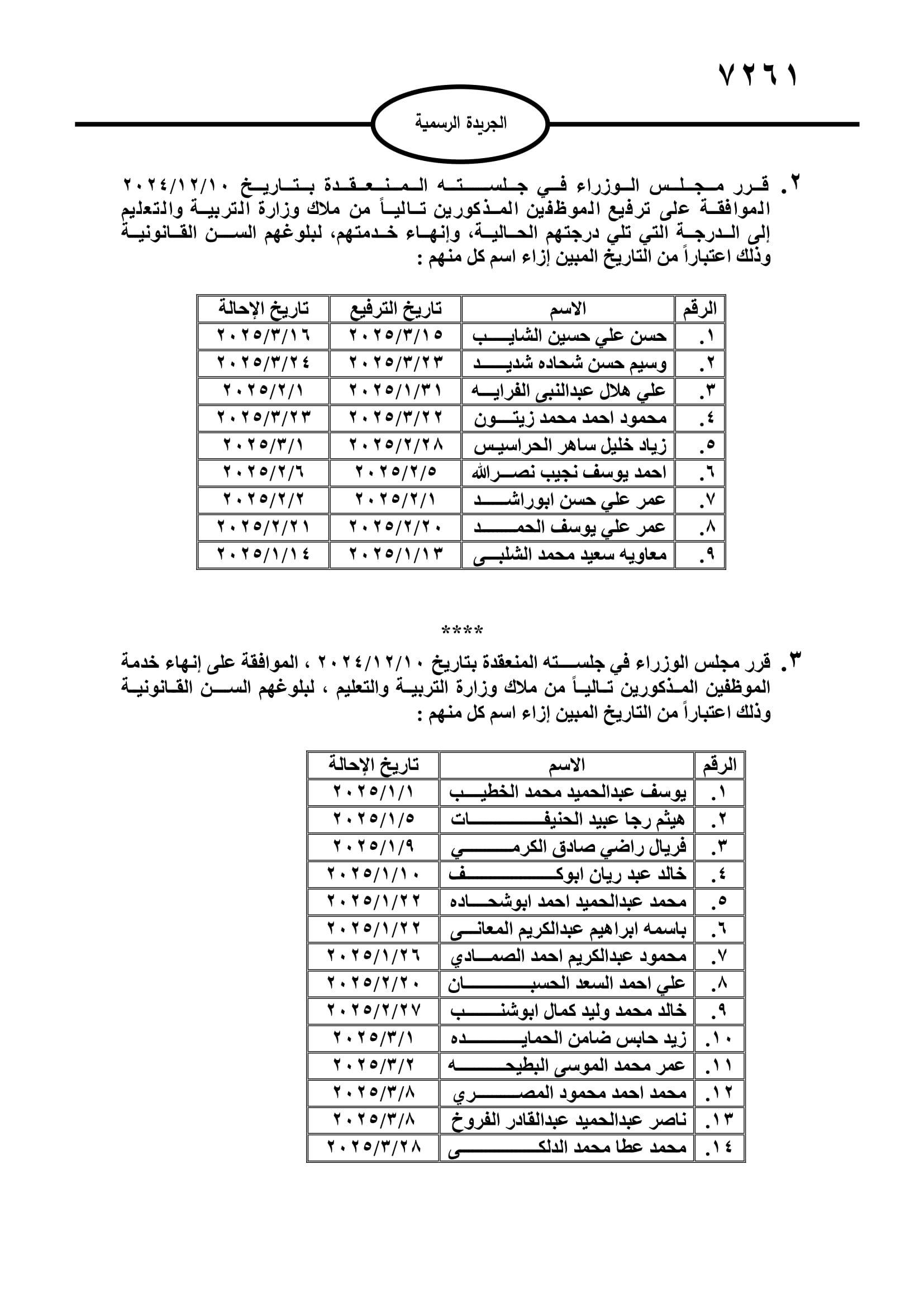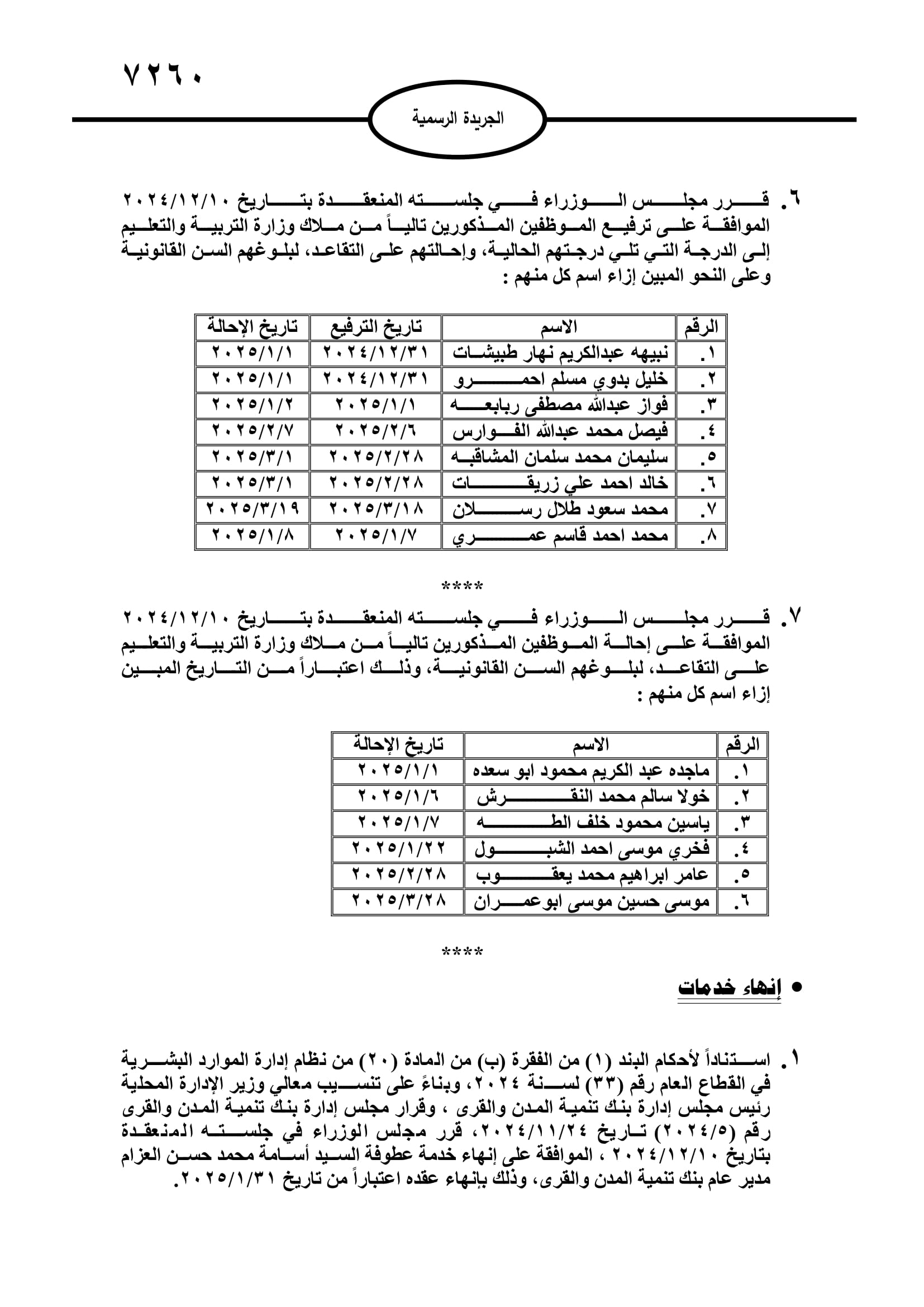 إنجاز-صدر في عدد الجريدة الرسمية اليوم الاثنين، قرارات مجلس الوزراء بإحالة عدد من موظفي الدولة الى التقاعد، وانهاء خدمات آخرين.